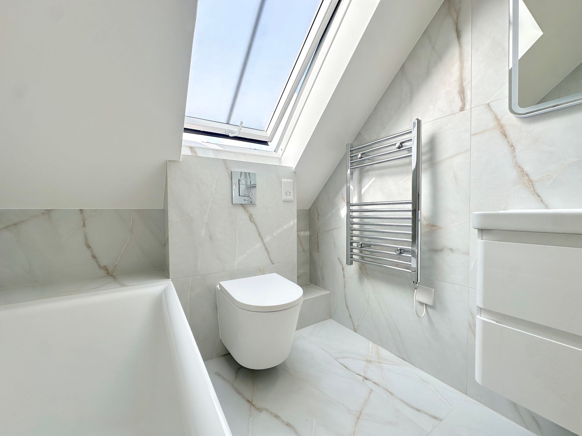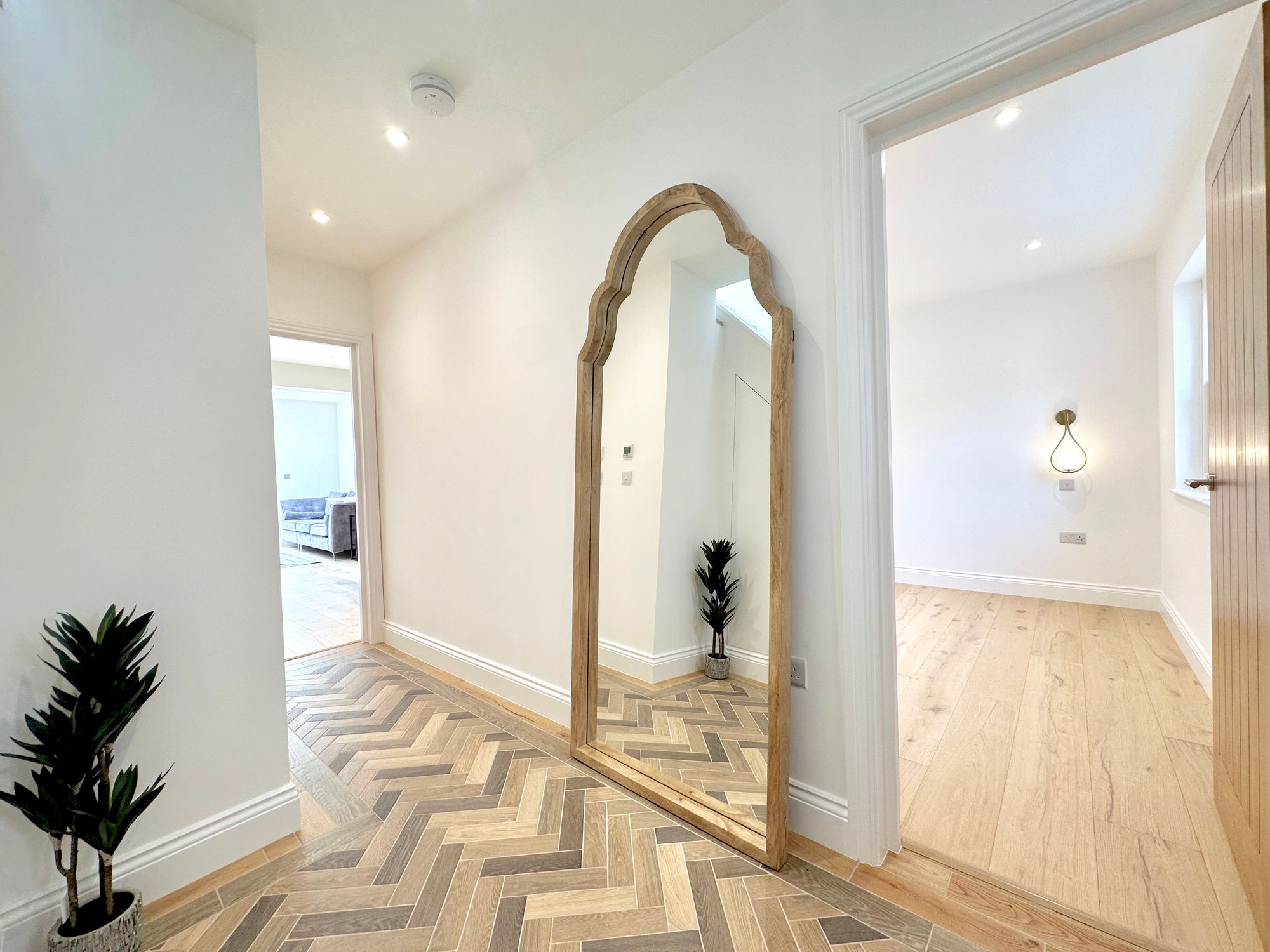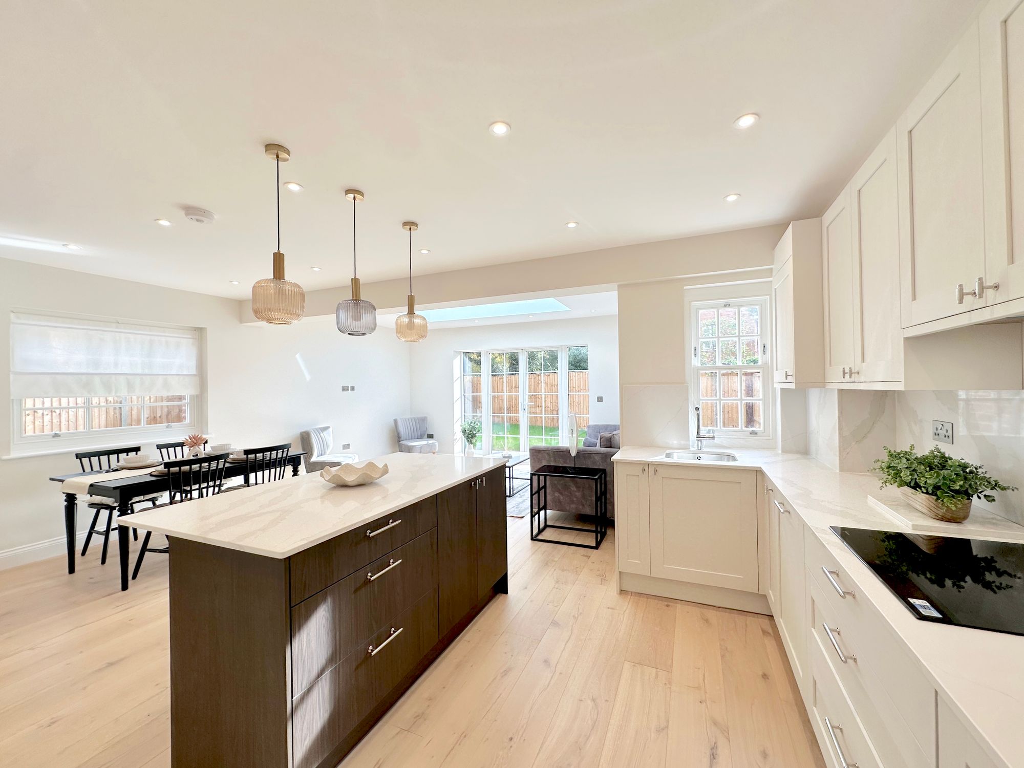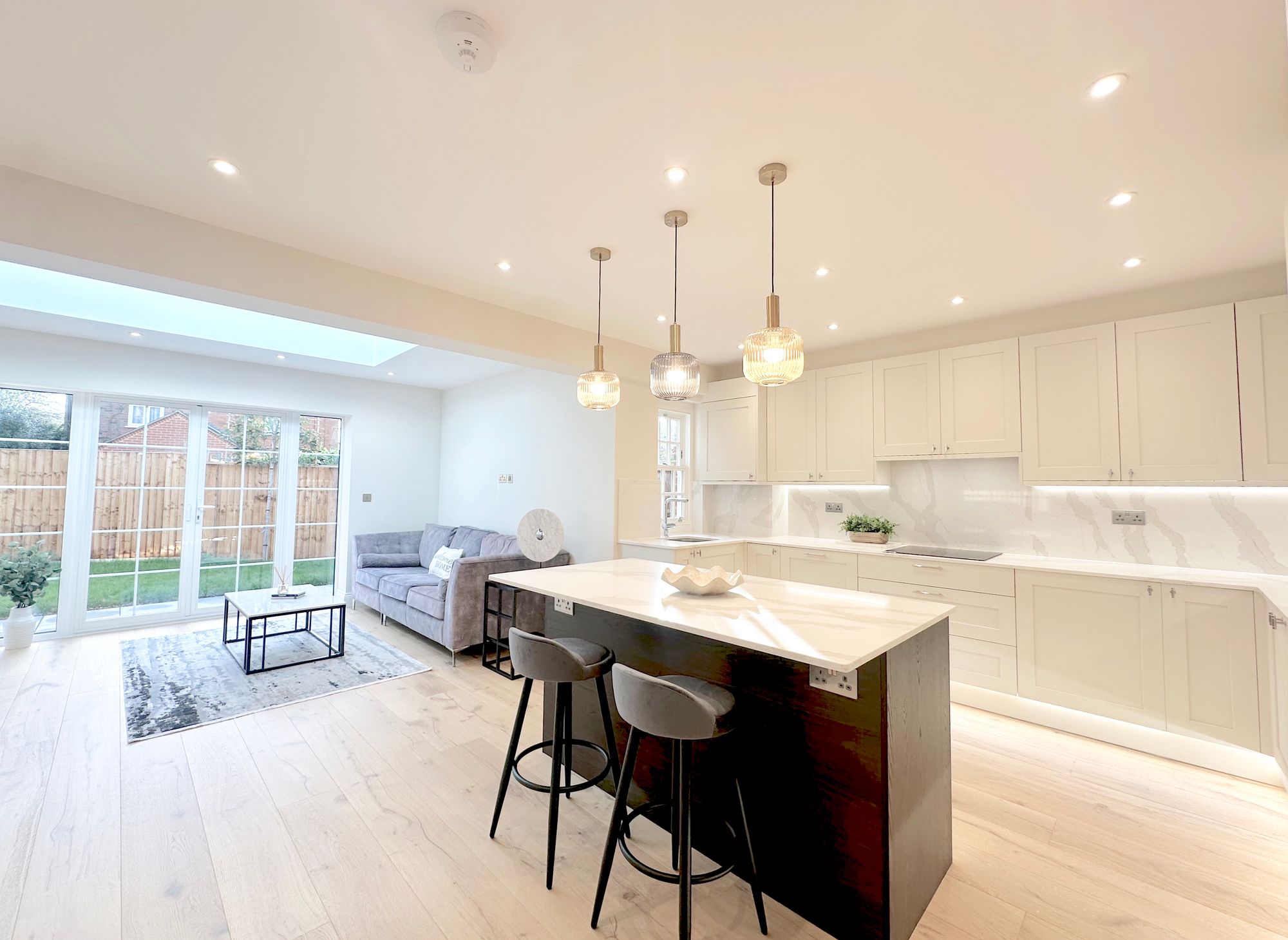 Comprising a downstairs bedroom and bathroom, a fully-fitted luxury kitchen, dining and living ‘Super-Room’, two double-aspect first floor bedrooms and a second bathroom upstairs. Underfloor heating throughout! Both have easy-maintenance, South-facing rear gardens with patio area, lawn and gated side access. Convenient parking to the side. CHAIN FREE